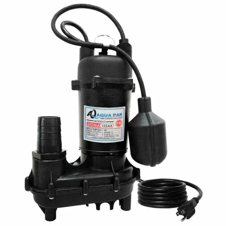 La Motobomba sumergible para achique Aquapak SIGMA155AX  diseñada para aplicaciones domésticas (Hogar y comercios)  con agua limpia, cuenta con motor asíncrono, ideal para desagüe de espacios inundados como sótanos, edificios, evacuación de aguas fecales y residuales, fuentes decorativas, cascadas, vaciado de piscinas y depósitos,etc. Su bomba en polipropileno con carga en fibra de vidrio y base en hierro fundido, impulsor tipo vortex construido en hierro fundido.
