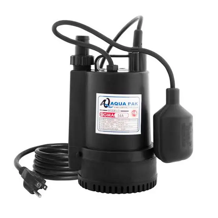 La Motobomba sumergible para achique Aquapak SIGMA54A diseñada para aplicaciones domésticas (Hogar y comercios) con agua limpia, ideal para desagüe de espacios inundados como sótanos, edificios, evacuación de aguas fecales y residuales, fuentes decorativas, cascadas, vaciado de piscinas y depósitos,etc. Su bomba con cuerpo de propileno con carga de fibra de vidrio, impulsor tipo abierto.Con un rango de carga de 1.5 a 6 metros y un rango de flujo de 25 a 68 litros por minuto, esta motobomba es la elección inteligente para tus necesidades de bombeo.