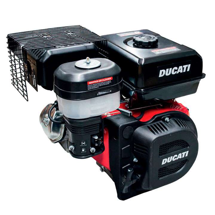 Motor Ducati DPE125420VE. a gasolina a 4 tiempos de 16 hp tipo cuñero, equipado con un tanque de combustible de 6.5 L y una capacidad de aceite de 1.1 L, 420 cc. y arranque manual.