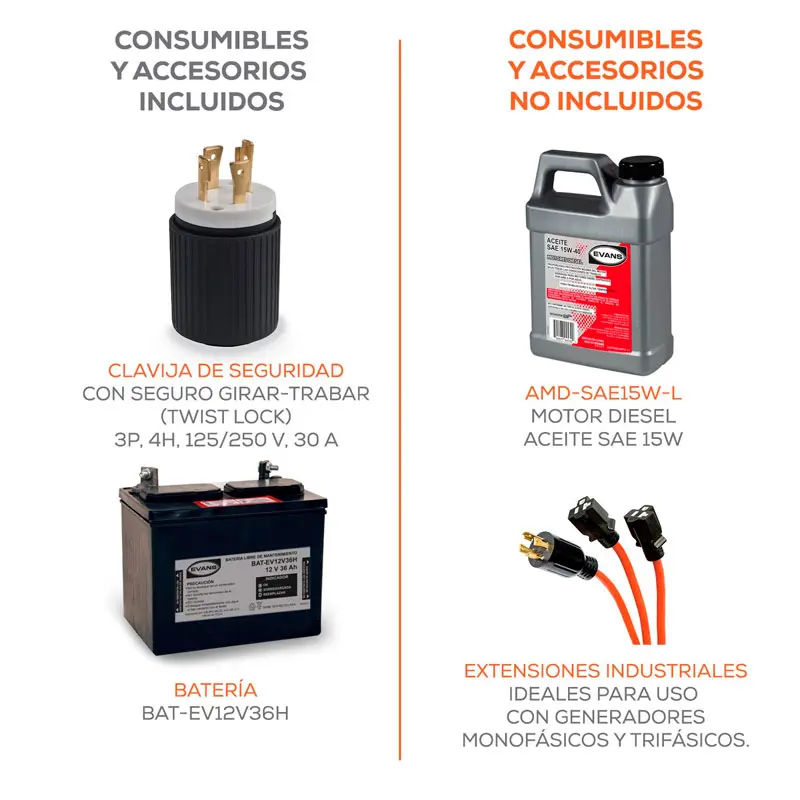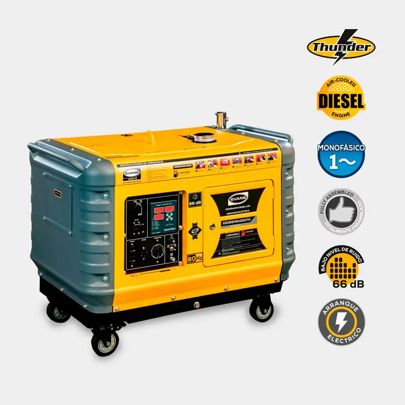 El Generador Evans GS085MD1200TH ofrece una solución confiable y potente para suministro eléctrico en construcción y emergencias, equipado con un motor Thunder Diesel de 12 HP, proporciona una potencia máxima de 8.5 kW y una nominal de 6.5 kVA, asegurando un rendimiento eficiente y constante, su sistema de arranque eléctrico facilita la puesta en marcha, mientras que su tanque de 14.5 litros permite hasta 8.5 horas de autonomía al 50% de carga.
