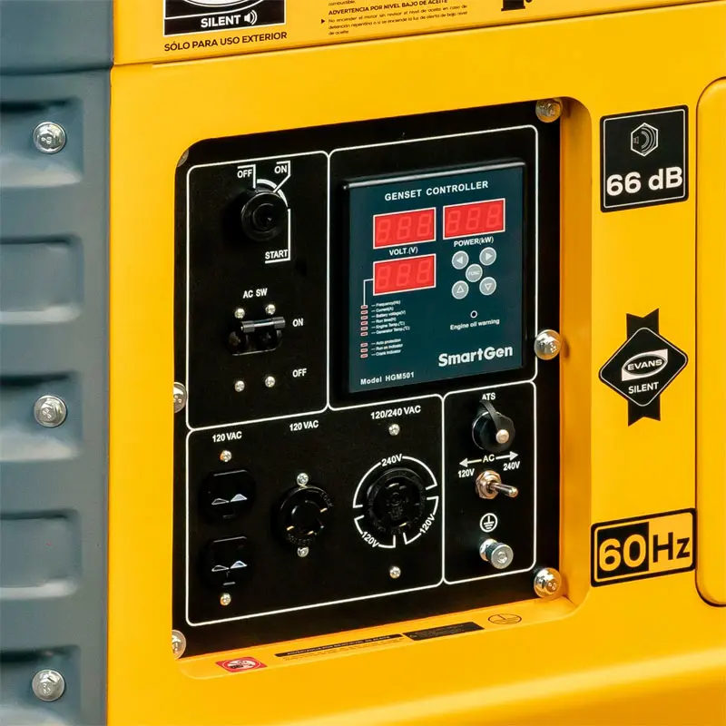 | Panel de control | 1 contacto dúplex, 1 Twist Lock L5-30R, 1 Twist Lock L14-30R, bornes 12VDC, Main Breaker, Panel digital |
