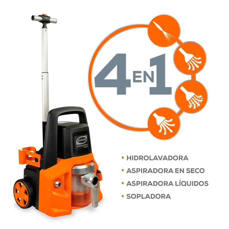 - Función 4 en 1: Hidrolavadora, aspiradora en seco y húmedo, y sopladora.