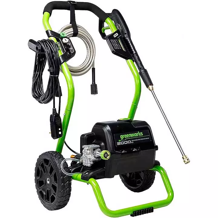 La Hidrolavadora GreenWorks GPW2000-1RG su motor de 13 amperes ofrece un flujo constante de agua y gran presión para eliminar fácilmente el lodo, la mugre y otros residuos adheridos, tu aliada para limpiar de forma eficiente patios, terrazas, vehículos y más con esta potente hidrolavadora eléctrica de alto rendimiento,