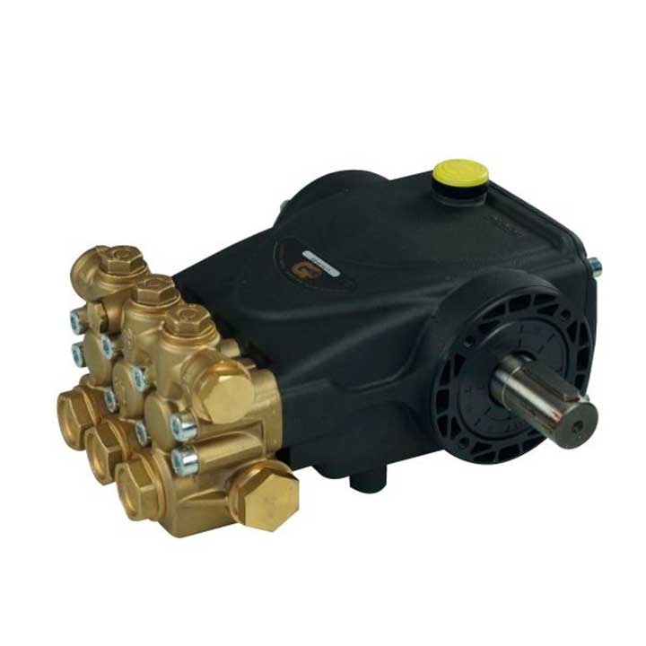 Bomba marca General Pump para motor eléctrico o de combustión con flecha sólida 24 mm (poleas para ambos motores o cople para motor eléctrico o reductor para combustión) y de pistón cerámico de 18 mm para su uso en Hidrolavadora de 1750 RPM.