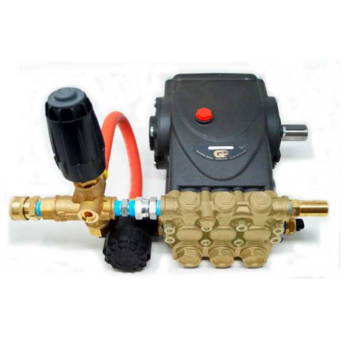 Bomba marca General Pump para motor eléctrico o de combustión con flecha sólida 24 mm (poleas para ambos motores o cople para motor eléctrico o reductor para combustión) y de pistón cerámico de 18 mm para su uso en Hidrolavadora de 1750 RPM.