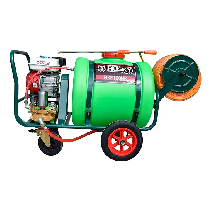 La Parihuela Husky HKF160HK  es una solución  eficiente diseñada para aplicaciones agrícolas intensivas, equipada con un motor Swedish Husky Power de 6.5 HP y 4 tiempos, garantiza un rendimiento confiable y un consumo eficiente de combustible, su tanque de 160 litros y manguera de 100 metros ofrecen gran capacidad de cobertura, ideal para la fumigación de árboles cítricos, caña de azúcar, maíz y otros cultivos, así como el control efectivo de plagas.