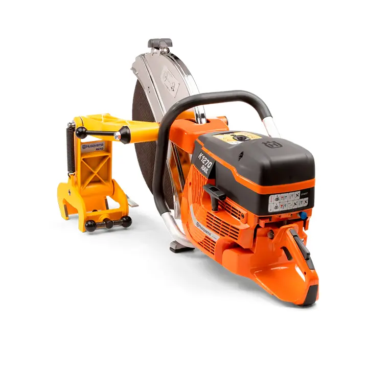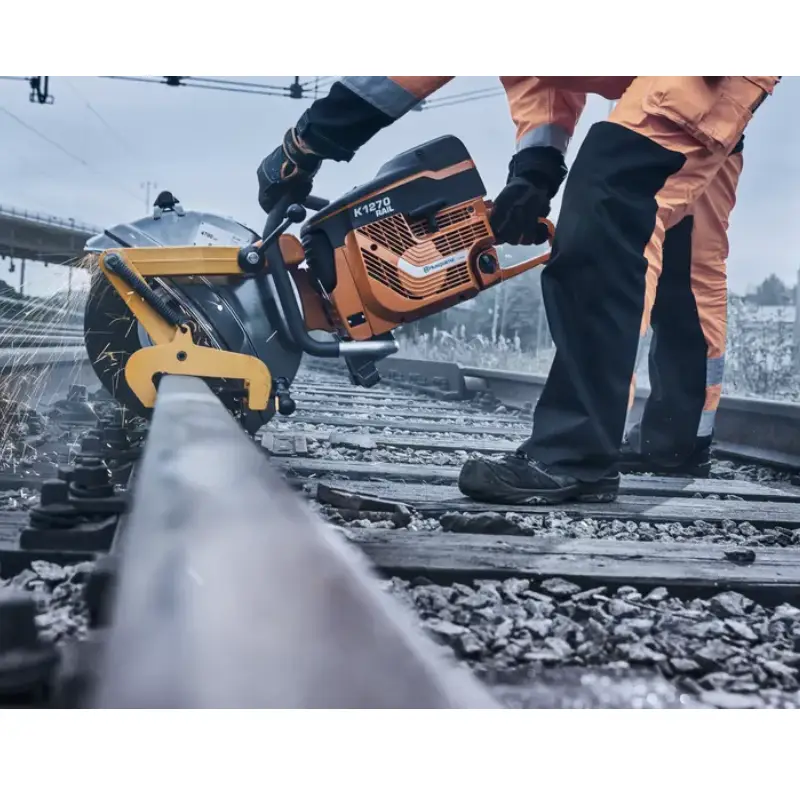 La Tronzadora Husqvarna K1270-RIELES es la cortadora más potente del mercado, personalizada para ferrocarriles, vías de tranvía y sistemas de metro, el accesorio se monta rápidamente en el riel y los soportes dobles del accesorio permiten cortar desde cualquier dirección.