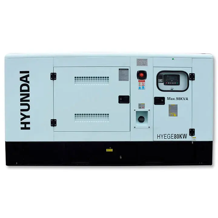 Generador trifásico de cabina Hyundai HYEGE80KW  con motor de diesel marca KOREI de 140 hp. No incluye batería de arranque. Panel de control digital, equipado con sensor contra sobrecarga alto y bajo voltaje, alta y baja frecuencia, bajo nivel de aceite y sobrecalentamiento, es  silenciosa con aislamiento acústico, su tablero automático de transferencia (ats) y paro de emergencia y switch de transferencia automática, lo hacen un equipo ideales para energía de emergencia en la industria, comercio, hospitales, hoteles, restaurantes, etc.