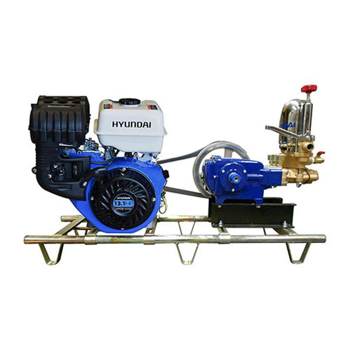 La fumigadora Parihuela Hyundai HYD5513H acoplada con motor a gasolina de 4 tiempos con potencia de 13.1 hp, Equipada con pistones de acero proporcionando mayor durabilidad en la utilización de agroquímicos, Es ideal para la fumigacion de arboles cítricos, caña de azucar, maiz y todo tipo cultivos y control de plagas. Incluye manguera de succión, lanza y coladera. Con manija regulable para la presión.