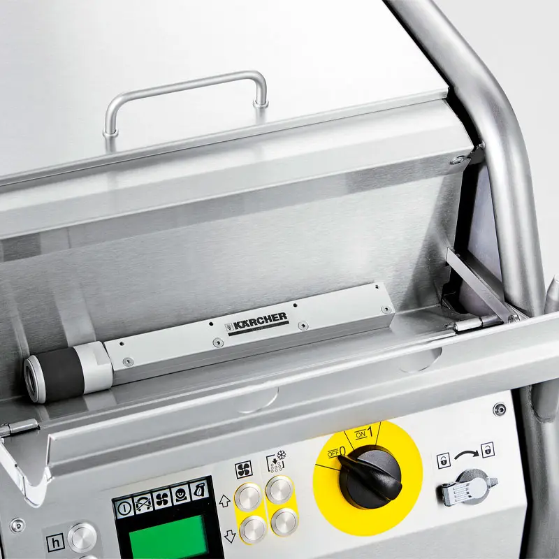 El diseño de la Karcher IB 15/120 prioriza la seguridad y facilidad de uso, su pistola pulverizadora ergonómica permite alternar entre aire comprimido y hielo seco, adaptándose a distintos tipos de limpieza, con un sistema de control electrónico y un enrollador de cable integrado, esta fregadora ofrece máxima movilidad y comodidad para el operador, garantizando resultados superiores en el menor tiempo posible.