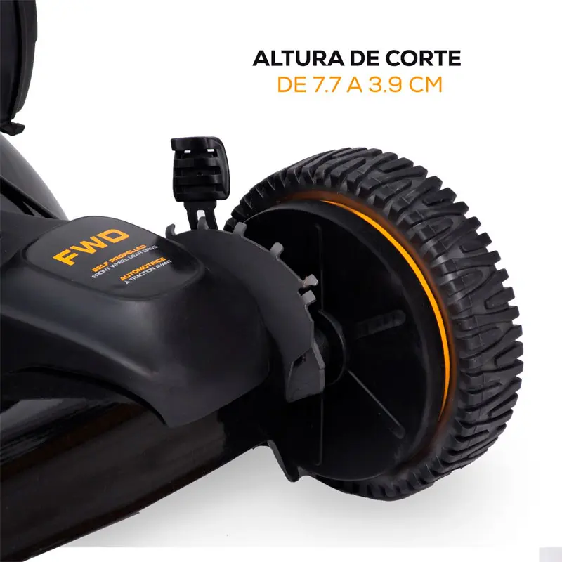 Equipada con un sistema de carcasa multifunción 3 en 1, esta podadora ofrece triturado extrafino, descarga lateral o recolección en bolsa, adaptándose a diferentes necesidades de jardinería, además, su diseño de ruedas traseras altas de 12” proporciona mayor estabilidad y maniobrabilidad, facilitando su uso en superficies con ligeros desniveles o zonas de difícil acceso.