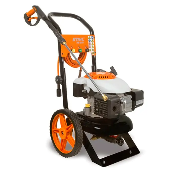La Hidrolavadora Stihl RB 400 es una herramienta a gasolina con manguera de 7.5 m, potencia de 6.5 HP y presión máxima de 2,700 psi. Incluye boquillas de acero inoxidable, manillar plegable y sistema antivibración para facilitar su uso. Con un peso de 41 kg, proporciona estabilidad y resistencia durante la limpieza a alta presión.