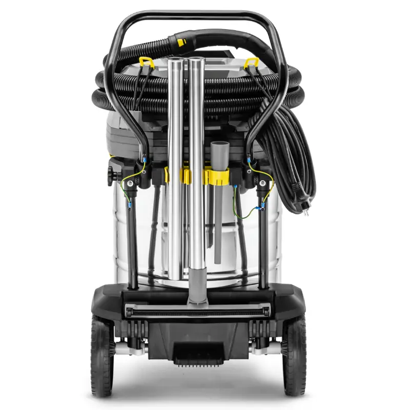 Este modelo cuenta con un depósito de gran capacidad fabricado en acero inoxidable, asegurando resistencia ante el uso rudo y la manipulación de líquidos, polvos finos o gruesos, su filtro plegado plano de fibra de vidrio de clase M permite una recolección segura de polvos peligrosos, mientras que su sistema de aspiración incluye boquillas versátiles y manguera electroconductora de 4 metros que facilitan el alcance y cobertura de espacios amplios.